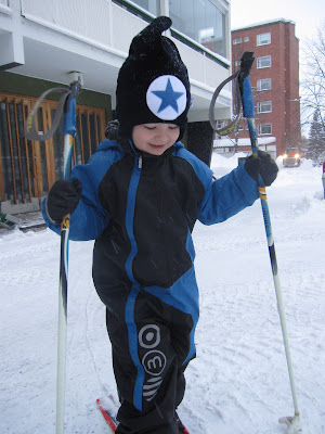 Käytiin tänä aamuna ensimmäistä kertaa hiihtämässä! Tai en tiedä voiko tässä ihan hiihtämisestä puhua, mutta ainakin kokeilemassa suksia. Meillä on yhdet sukset, jotka saimme käytettyinä ystävän lapsilta. Sukset saimme säädettyä sopiviksi, mutta sauvoissa oli ehkä hieman kasvunvaraa..